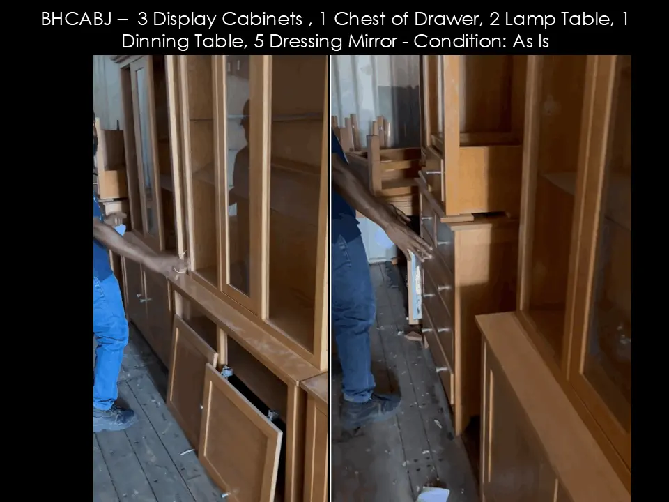 BHCABJ – 3 Display Cabinets , 1 Chest of Drawer, 2 Lamp Table, 1 Dinning Table, 5 Dressing Mirror - Condition: As Is